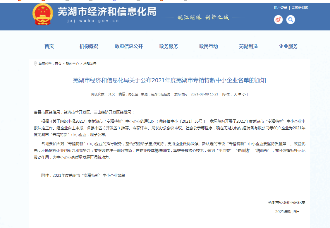 喜訊----熱烈祝賀我公司被授予“蕪湖專精特新中小企業(yè)”榮譽(yù)稱號