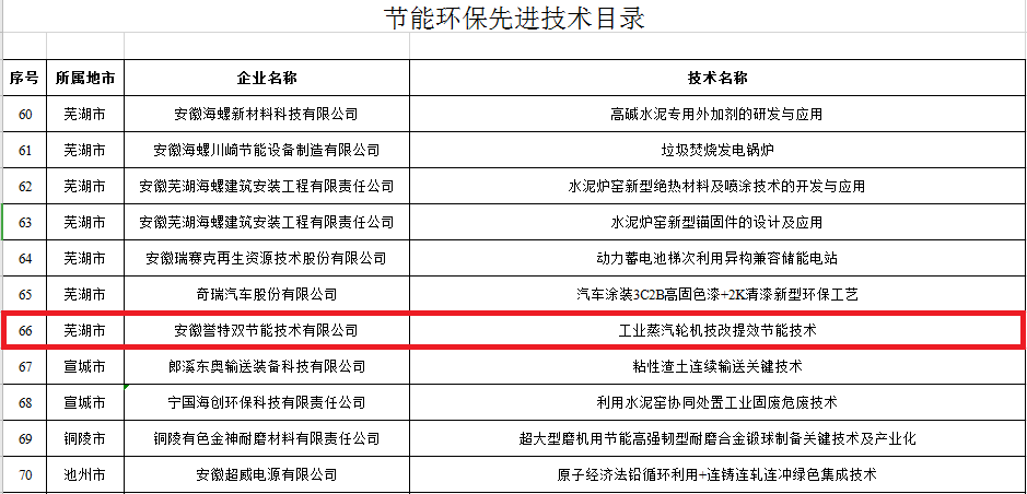 12月2日,安徽省經(jīng)濟(jì)和信息化廳發(fā)布了2019年全省工業(yè)領(lǐng)域節(jié)能環(huán)保產(chǎn)業(yè)“五個(gè)一百”推介目錄公告,安徽譽(yù)特雙節(jié)能技術(shù)有限公司入選《節(jié)能環(huán)保服務(wù)機(jī)構(gòu)目錄(2019)》,也是蕪湖市唯一的入選單位,同時(shí)公司節(jié)能技術(shù)“工業(yè)蒸汽輪機(jī)技改提效節(jié)能技術(shù)”入選《節(jié)能環(huán)保先進(jìn)技術(shù)目錄(2019)》。