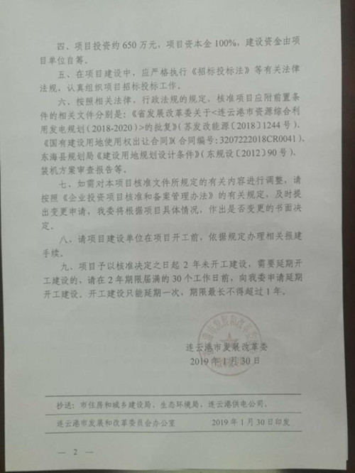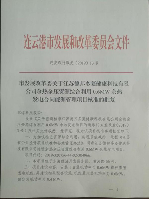 該項目當前進展順利,經大力推動,已順利獲取《江蘇省發(fā)展改革委關于<連云港市資源綜合利用發(fā)電規(guī)劃(2018-2020)>的批復》(蘇發(fā)改能源〔2018〕1244號)、《連云港市發(fā)展改革委關于江蘇德邦多菱健康科技有限公司余熱余壓資源綜合利用0.6MW余熱發(fā)電合同能源管理項目核準的批復》(連發(fā)改行服發(fā)〔2019〕13號)、《東??h發(fā)改委關于報請核準江蘇德邦多菱健康科技有限公司余熱余壓資源綜合利用0.6MW余熱發(fā)電項目的請示》(東發(fā)改發(fā)〔2019〕3號)、《裝機方案審查報告》等文件和項目核準批文。