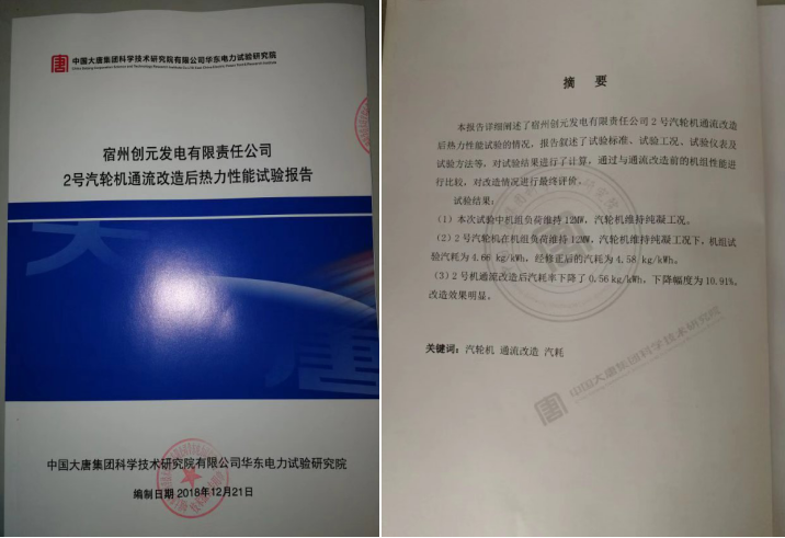 由具備國家一級專業(yè)資質(zhì)——中國大唐集團科學(xué)技術(shù)研究院有限公司華東電力試驗研究院,對照機組改造前實際運行參數(shù),純凝運行工況汽耗值為5.14kg/kw.h,改造后機組純凝工況汽耗值為4.58kg/kw.h,在同等運行工況條件下,汽耗值下降0.56kg/kw.h,下降幅度即節(jié)能提效比例為10.91%,按原機組12MW同等運行工況條件下,可實現(xiàn)節(jié)能提效電量為1309.2kw/h,按年運行7500小時計算,年可實現(xiàn)節(jié)能經(jīng)濟效益490萬元,節(jié)能效益與社會效益均非常顯著。