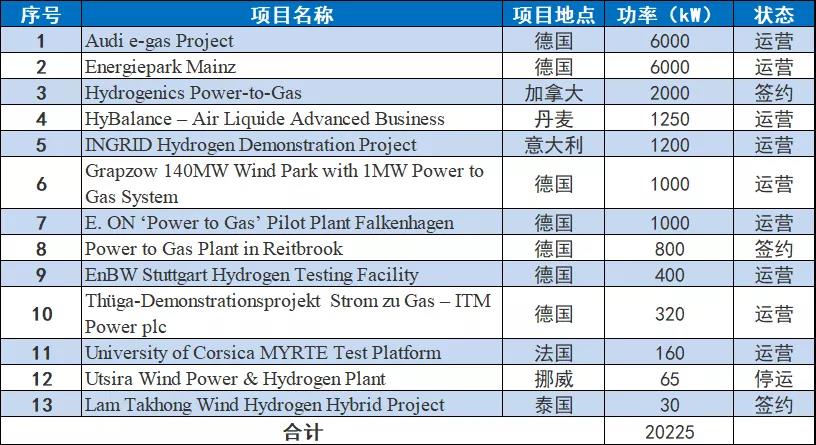 根據(jù)美國能源部統(tǒng)計數(shù)據(jù)顯示目前,全球共有13個氫儲能項目,其中9個處于運營狀態(tài),這13個項目的額定功率共計20.23MW;另外值得注意的是,這13個項目中,有7個位于德國。