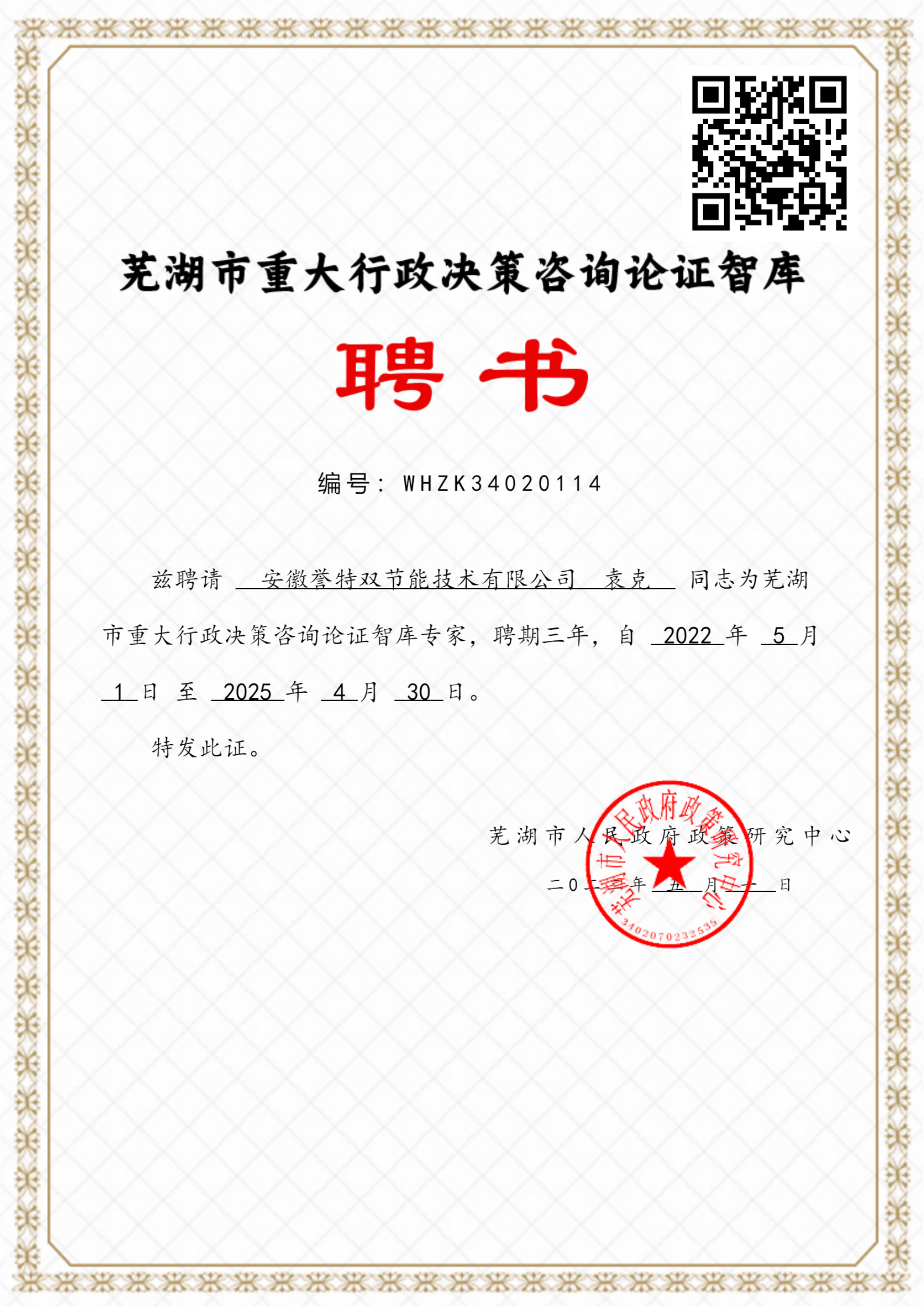 我公司總經(jīng)理袁克同志,榮聘蕪湖市重大行政決策咨詢論證智庫專家組成員。
