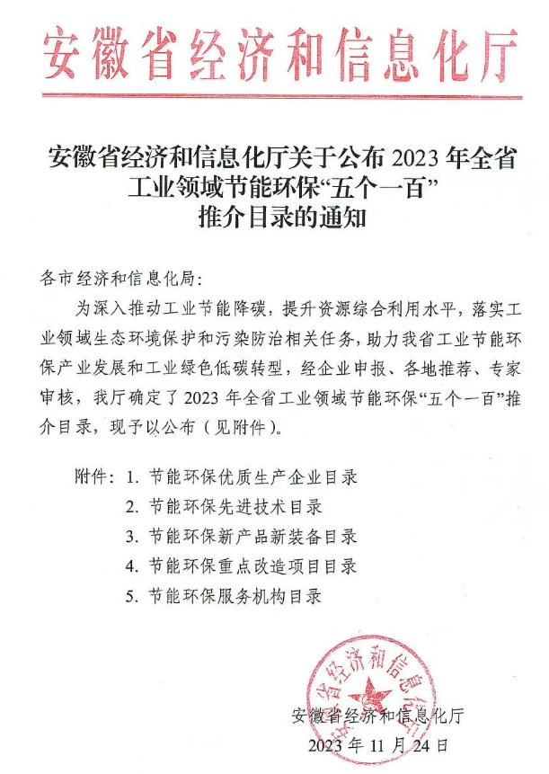 公司三項目入選2023年度安徽省工業(yè)領(lǐng)域節(jié)能環(huán)保“五個一百”推介目錄