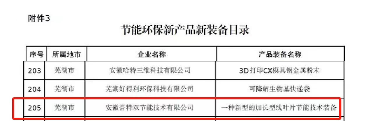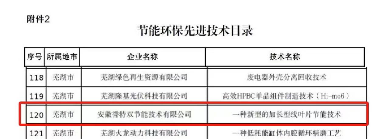 公司分別入選省“節(jié)能環(huán)保服務(wù)機構(gòu)目錄”、核心技術(shù)“一種新型的加長型線葉片節(jié)能技術(shù)”入選節(jié)能環(huán)保先進技術(shù)目錄、核心產(chǎn)品“一種新型的加長型線葉片節(jié)能技術(shù)裝備”入選節(jié)能環(huán)保新產(chǎn)品新裝備目錄。其中,節(jié)能環(huán)保服務(wù)機構(gòu)目錄名單,安徽省全行業(yè)領(lǐng)域共28戶,蕪湖市僅2戶,我公司榮登榜單,此次入選,為公司連續(xù)6年入選,在此表示熱烈祝賀。