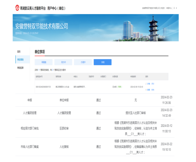 2024年3月22日,經(jīng)我公司自主申報(bào),結(jié)合袁克個(gè)人榮譽(yù)資質(zhì)---安徽省委組織部第八批特支計(jì)劃領(lǐng)軍人才、安徽省人社廳第八批戰(zhàn)略性新興產(chǎn)業(yè)技術(shù)領(lǐng)軍人才等認(rèn)定基礎(chǔ)上,通過蕪湖市人才集團(tuán)評定,區(qū)縣人社部門審核,市人社局備案,我公司總經(jīng)理袁克同志喜獲蕪湖市高層次C1類人才認(rèn)定,并可按規(guī)定享受相應(yīng)的住房、教育、醫(yī)療、人才津貼等優(yōu)惠獎(jiǎng)補(bǔ)政策。