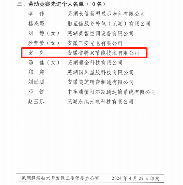 2024年429,中共蕪湖經濟技術開發(fā)區(qū)工委、蕪湖經濟技術開發(fā)區(qū)管委會發(fā)布《關于授予2023年度經開區(qū)勞動競賽先進集體、先進班組、先進個人稱號》通知文件,我公司總經理袁克榮獲“先進個人”榮譽稱號,在此表示熱烈祝賀。