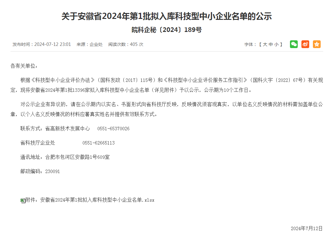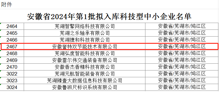 近日,根據(jù)《工業(yè)和信息化部辦公廳關(guān)于開展2024年度科技型中小企業(yè)評價工作的通知》(工信廳企業(yè)函﹝2024﹞244號)要求,通過企業(yè)評價、政府科技部門逐層審核,安徽省科學(xué)技術(shù)廳最終發(fā)2024年第1批入庫科技型中小企業(yè)名單,我公司榮列榜單,在此表示祝賀。