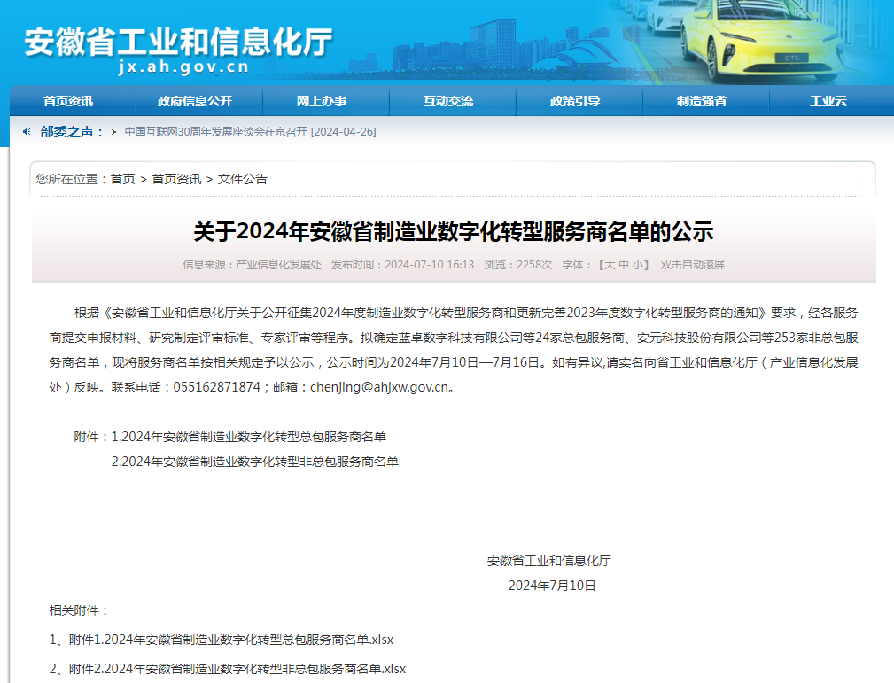 近日,根據(jù)《安徽省工業(yè)和信息化廳關(guān)于公開征集2024年度制造業(yè)數(shù)字化轉(zhuǎn)型服務(wù)商和更新完善2023年度數(shù)字化轉(zhuǎn)型服務(wù)商的通知》要求,經(jīng)各服務(wù)商提交申報材料、研究制定評審標(biāo)準(zhǔn)、專家評審等程序,由安徽省工業(yè)和信息化廳發(fā)布2024年安徽省制造業(yè)數(shù)字化轉(zhuǎn)型服務(wù)商名單,我公司名列其中,在此表示熱烈祝賀!