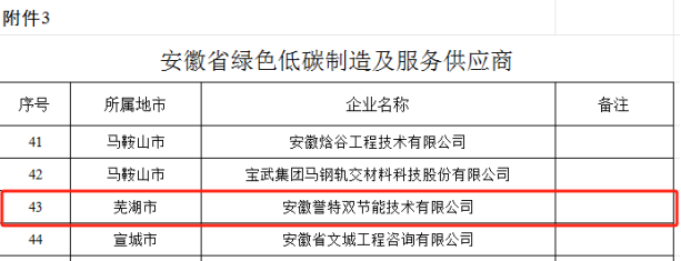 公司分別入選“安徽省綠色低碳產(chǎn)品(裝備)”、“安徽省綠色低碳技術(shù)”、“安徽省綠色低碳制造及服務(wù)供應(yīng)商”目錄。其中安徽省綠色低碳制造及服務(wù)供應(yīng)商目錄中,安徽省全行業(yè)領(lǐng)域共計(jì)58家企業(yè),我公司為蕪湖市唯一一家入選企業(yè),同時也是公司連續(xù)7年入選該目錄,再次表示熱烈祝賀!